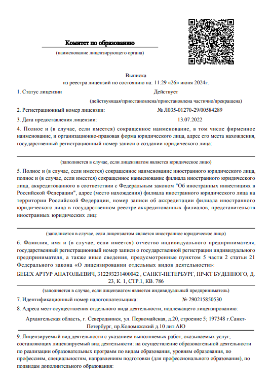 Центр обучения ИП Бебех А.А. имеет все необходимые документы, в том числе – лицензии на право ведения образовательной деятельности.